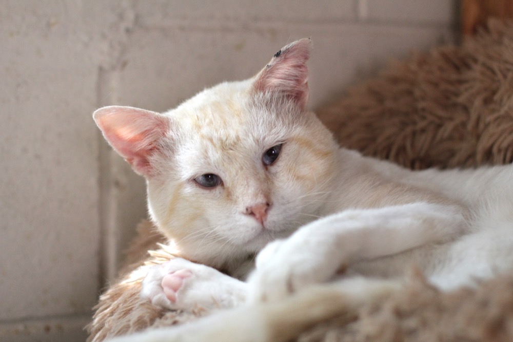 Romeo es un precioso gato grande de color blanco-crema, con una cabeza y unas mejillas muy anchas. Es fácil de reconocer en la gatera. Tiene unos preciosos ojos azules y las almohadillas de las patas rosadas 🥰