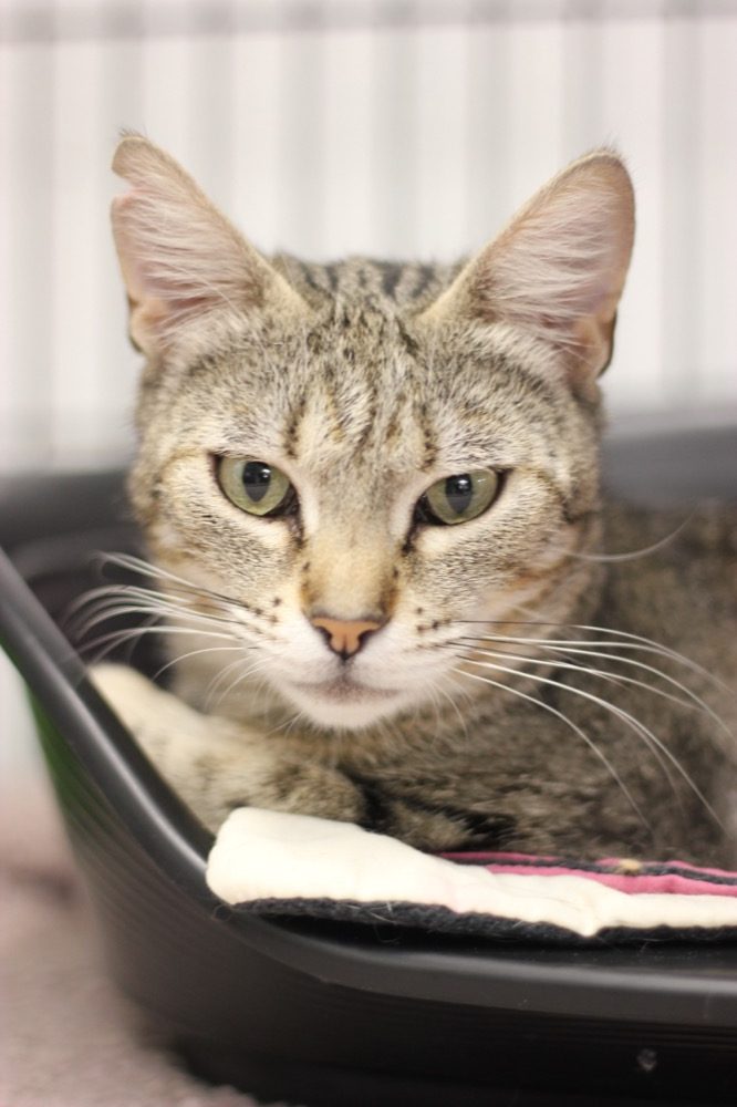 Una tigradeta molt bonica, de mirada desperta i expressió intel·ligent. És molt observadora, tranquil·la però atenta a tot. Gaudeix de les carícies i d’una bona llauneta. Seria una molt bona companya de vida.