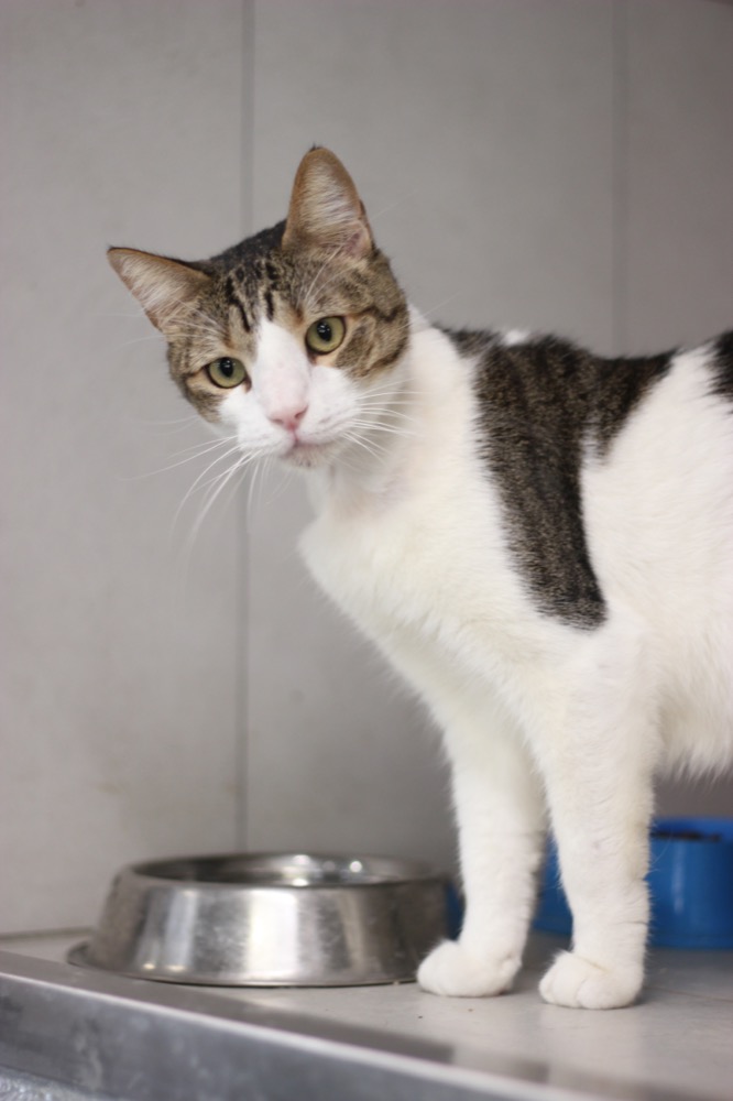 Un gat de mida gran, increïblement bo i molt sensible. Ha estat convivint a la gatera amb la resta de gats, però es va començar a deprimir i a deixar de menjar. Vam estar-lo alimentant per tub i ara sembla que està millor. El tenim en un espai més tranquil i ja ha recuperat una mica la gana i el seu caràcter mimos i dòcil.